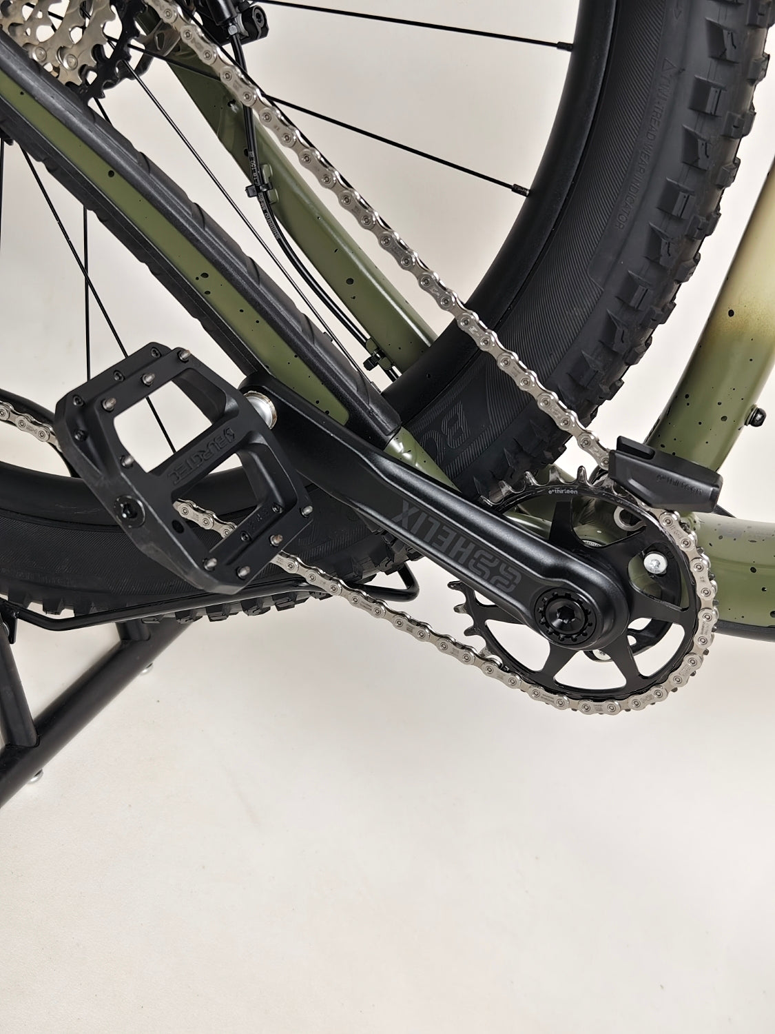 - Chainset: E*thirteen Helix, 30T steel ring, 73 mm spindle length, 52 mm chainline, 170 mm length